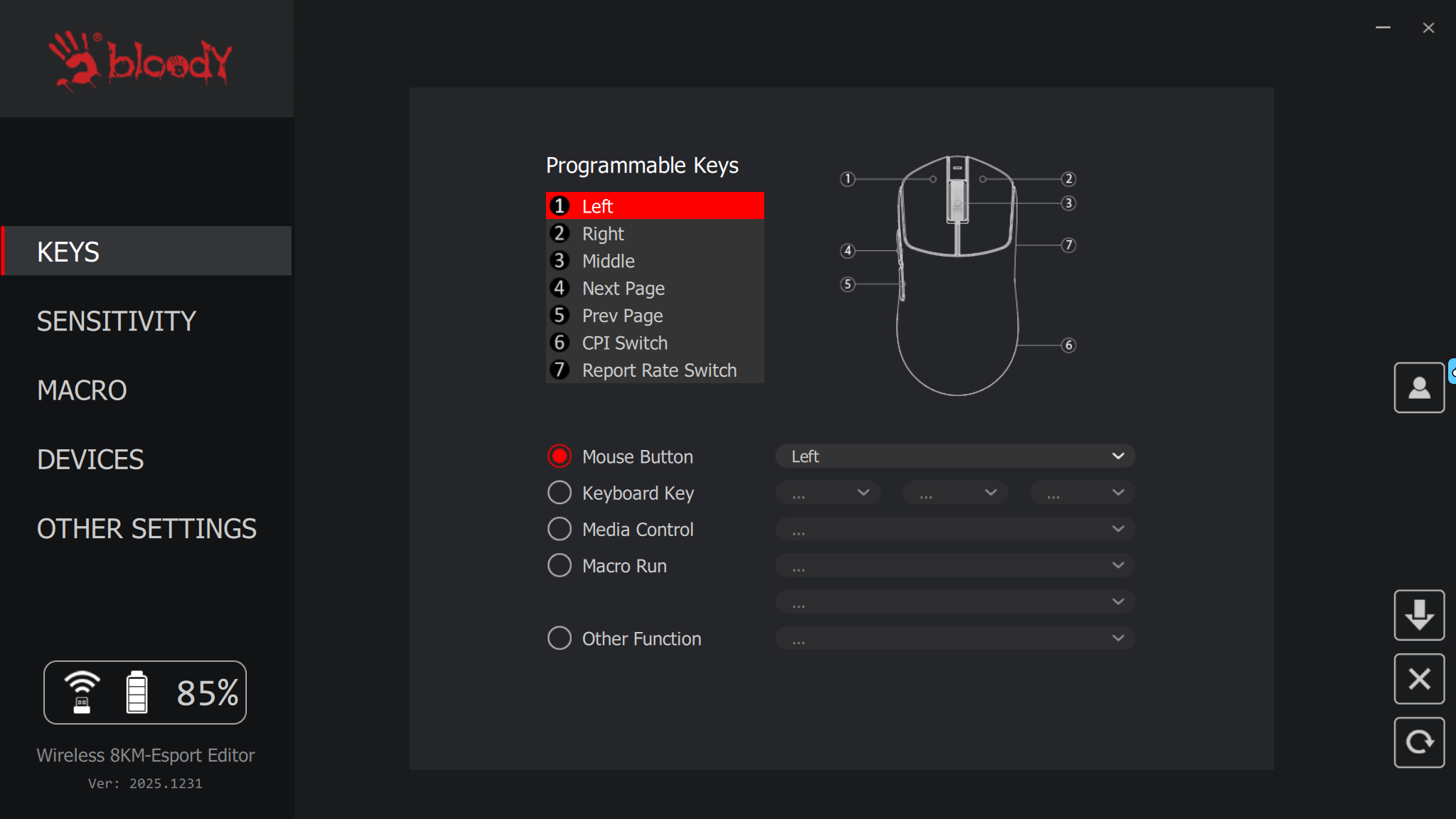 • Description : [BloodyWireless8KM-Esport] Provides simple combination settings and programming functions for wireless dual-mode mice. Players can optimize the suitable game configuration by programming the buttons, sensitivity, and keyboard and mouse combinations and save them to the mouse memory.