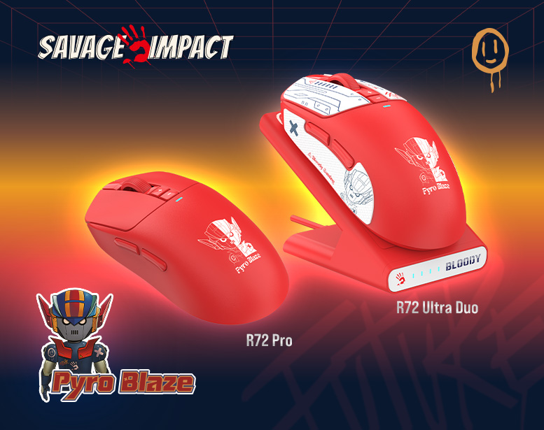 Bloody, бренд компьютерной периферии, расширяет ассортимент устройств, доступных в рамках коллаборации с Savage Impact. Беспроводные игровые мыши R72 Pro и R72 Ultra Duo получили новую красную расцветку с персонажем Pyro Blaze.