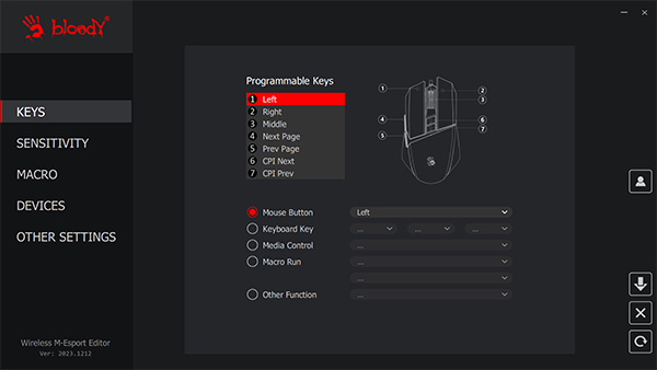 BLOODY ESPORT SOFTWARE Bloody Esport is a set of multifunctional mouse editing software. Optimize the most suitable game configuration through buttons, sensitivity, macro, and lighting, and save it in the mouse memory.
